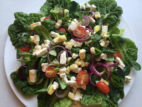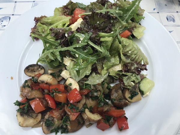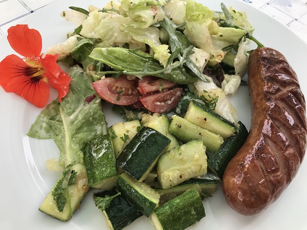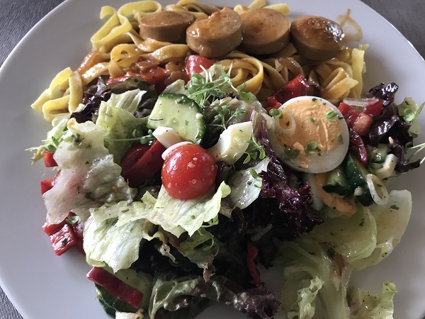 Bunter Salatteller mit Schafskäse | Fleischküchle mit Lauch-Paprikagemüse und breiten Nudeln | Zucchinigemüse mit roter Wurst und gemischtem Salat |