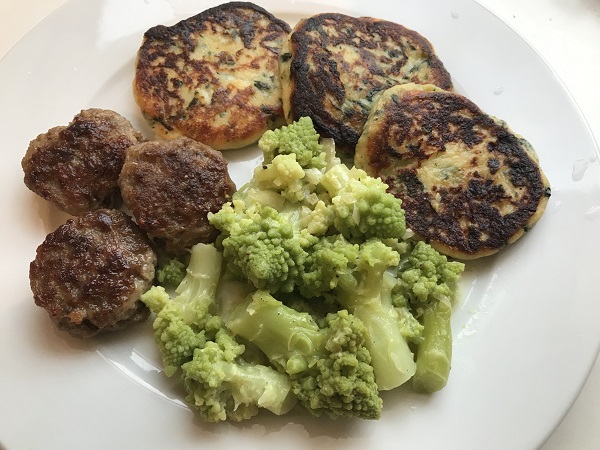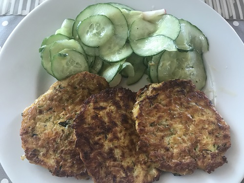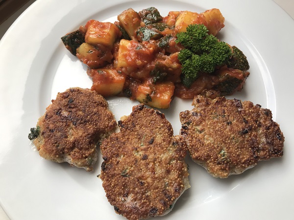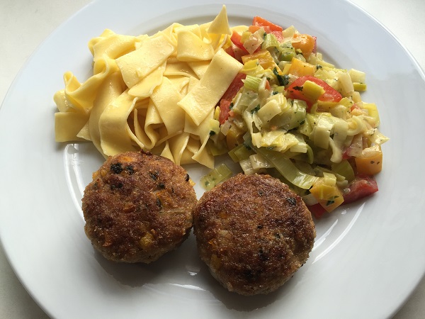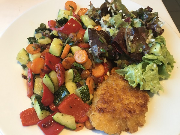 Amaranth Bratlinge mit Zucchinigemüse | Maultaschen mit Brokkoli und Ei, gemischtem Salat | Gemüsepfanne mit Hähnchenschnitzel und gemischtem Salat |