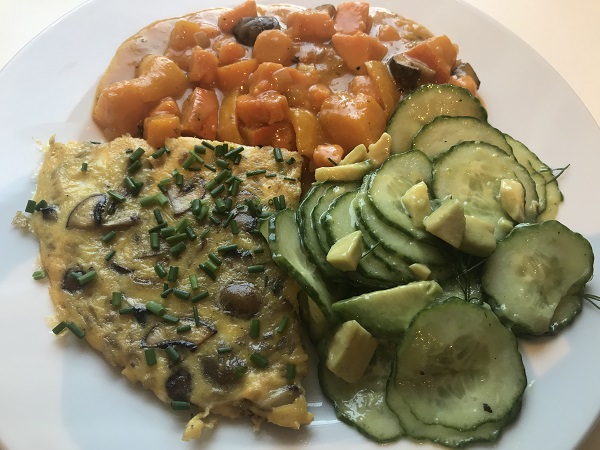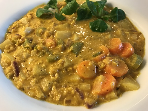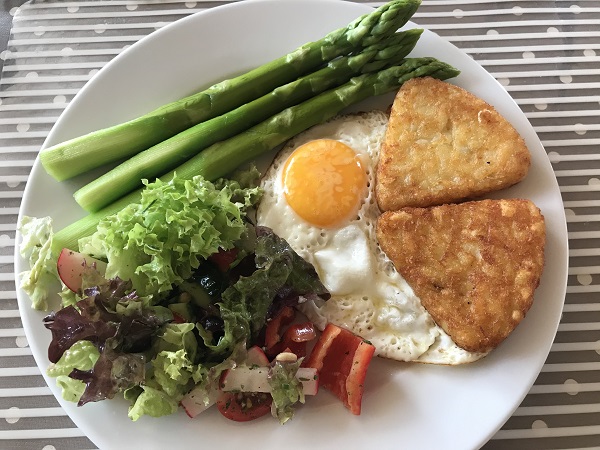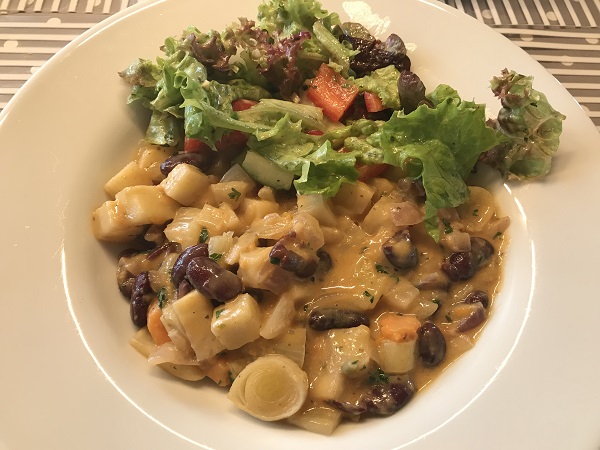 Gemüsecurry mit Sellerieknolle, Fenchel Lauch, Süßkartoffel, Kidneybohnen und rote Zwiebel. Dazu noch ein Salat | Spargel mit Spiegelei, Rösti und Salat | |