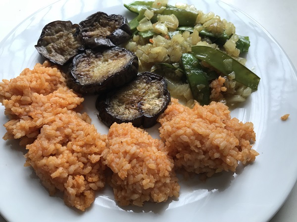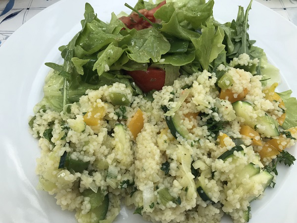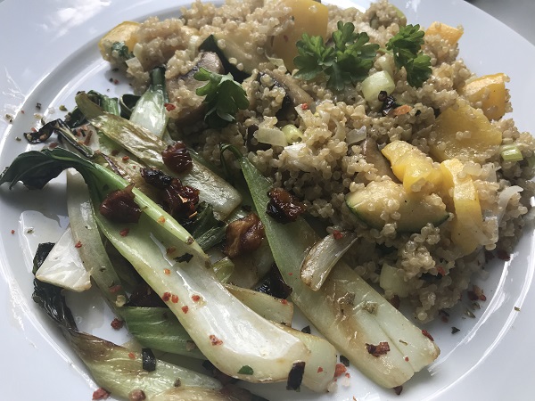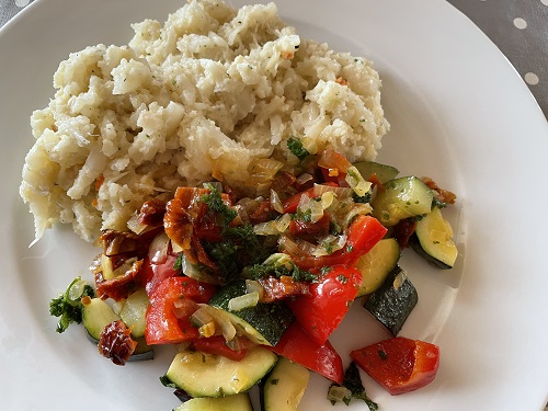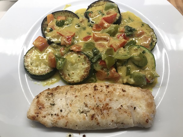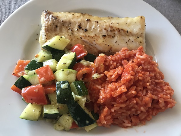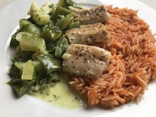 Quinoa mit Zucchini und Paprika, gemischtem Salat | Buntbarsch mit Auberginen und Paprikagemüse | Seelachs mit tomatenreis und Zucchinigemüse |