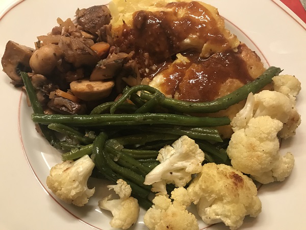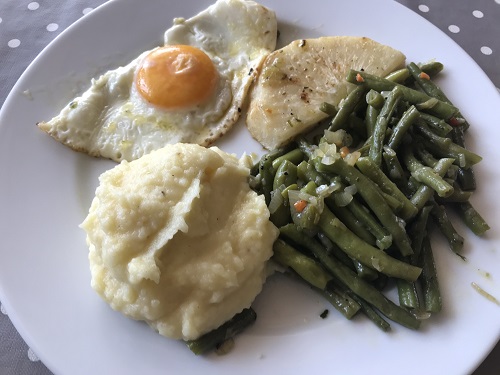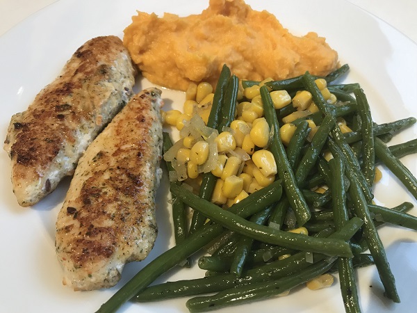 Hähnchenbrustfilet mit Bohnen-Maisgemüse und Süßkartoffelbrei | Quinoamit Lauch, gemischter Salat mit Spiegelei | Auberginen mit Tomatentopping und Gemüse |