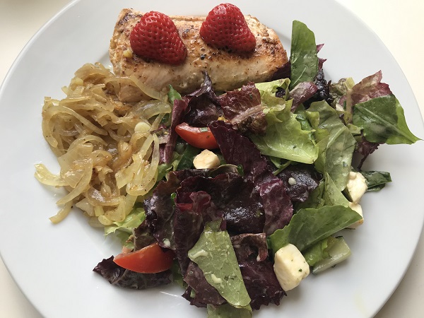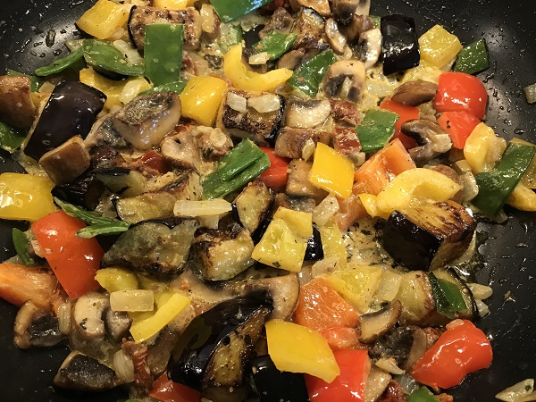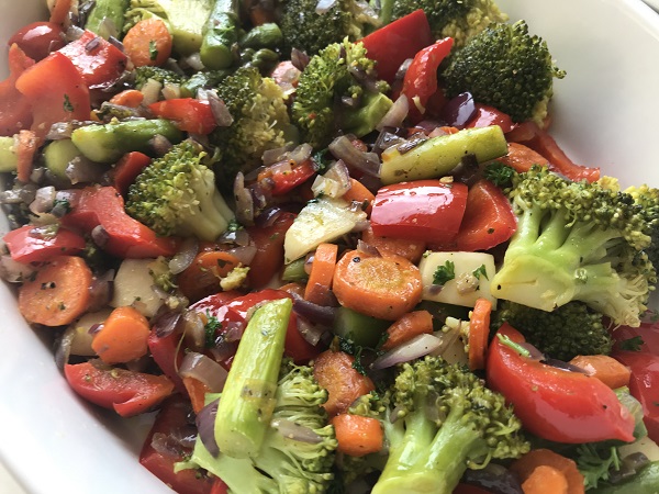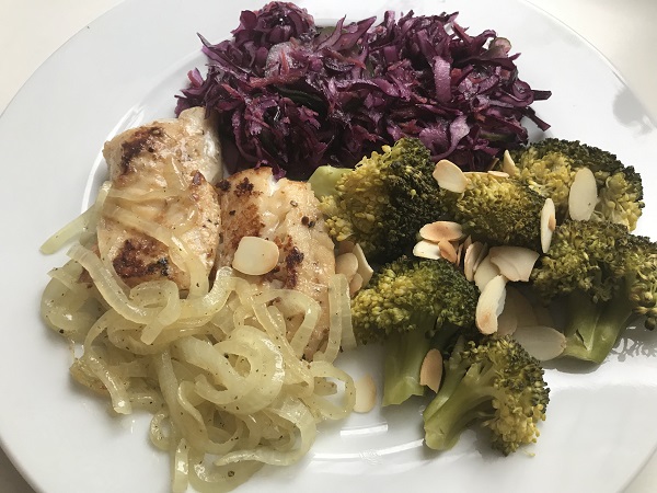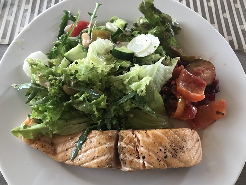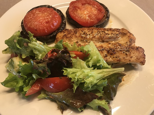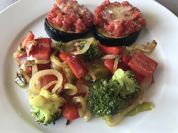 Pils-Paprikagemüse mit gemischtem Salat | Seelachsfilet mit Zwiebel, Brokkoli und Rotkohlgemüse | Auberginen mit Tomaten, Hünchenbrustfilet, Ackersalat und Gemüse |