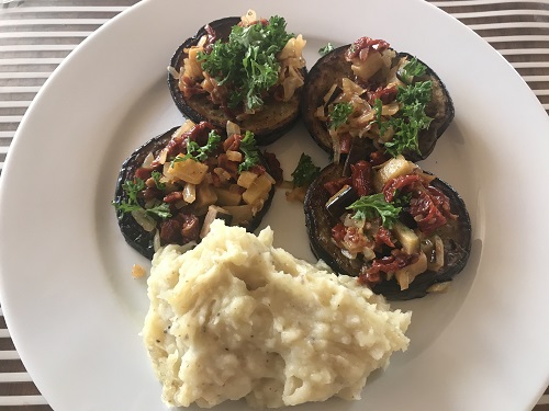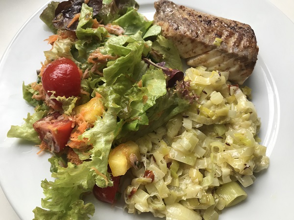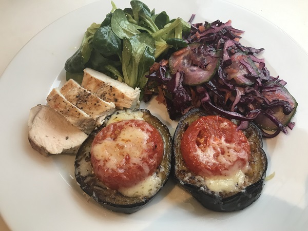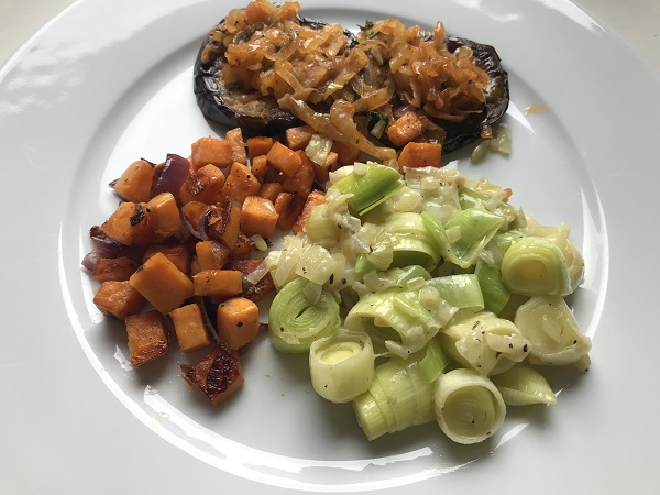 Auberginenauflauf mit Lauch | Selleriescheibe mit Bohnen und Kartoffelbrei, Spiegelei | Lachs mit Gemüse und Salat |