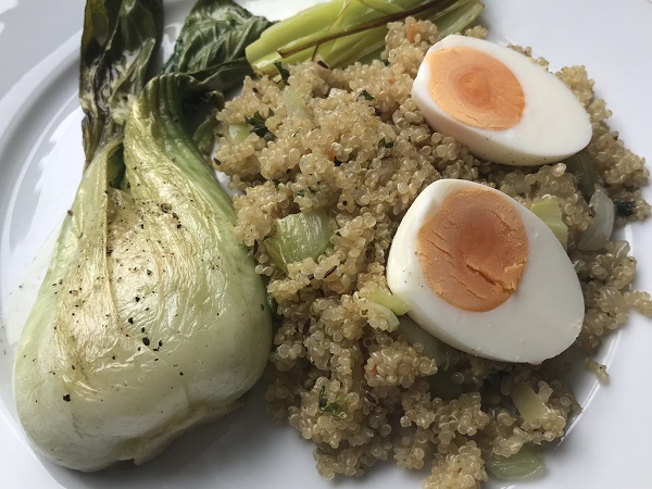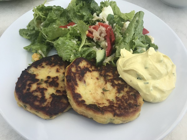Kartoffelküchlein (selbsgemacht) mit Romaesko und Fleischküchlein | Fisch, Auberginen mit Tomatenscheiben und Salat | Pak choi mit Quinoa und gekochtem Ei |