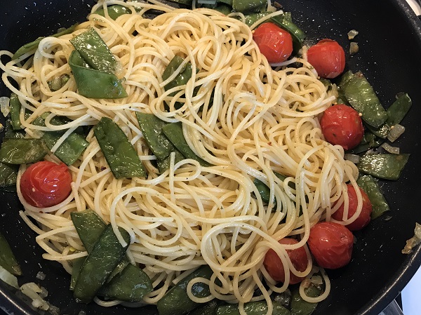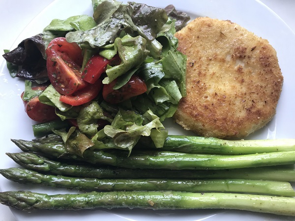 Spargel, panierter Selleriescheibe und gemischtem Salat | Spaghetti mit Tomaten und Zuckerschoten | Bunte Gemüsepfanne |
