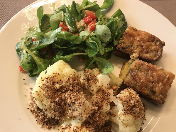 Gemüsekuchen im Blätterteig und gemischtem Salat | Fritatta mit Blumenkohl und Ackersalat | Pilzgemüse mit Kartoffelgratin, Bohnen und Blumenkhl |