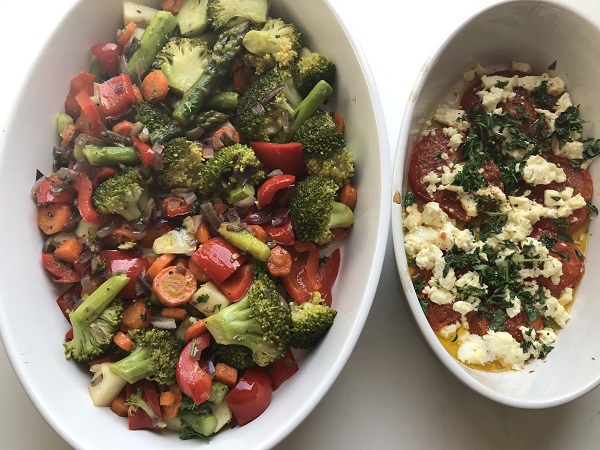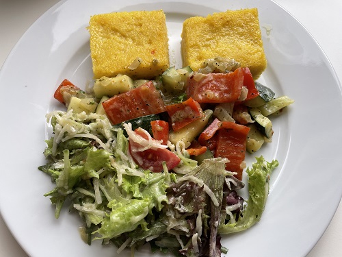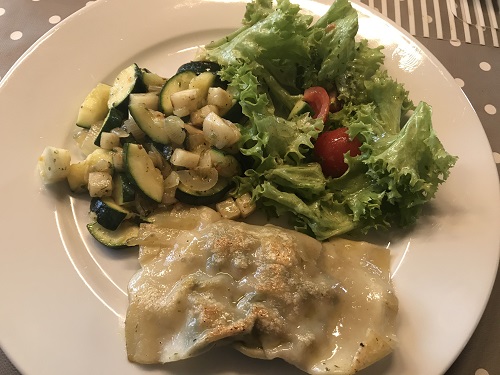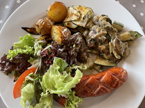 Ofenkartoffeln, gefüllte Zucchini mit Fetakäse, Pilz-Zucchinigemüse und rote Wurst | Tilapia mit Chicoreesalat und Lauch-Kartoffel gemüse | Polenta mit Gemüse und Salat |