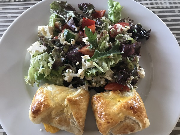 Buntes Gemüse, rote Zwiebel, Karotten, Kohlrabi, Paprika Brokkoli und Spargel. Dazu angebratene Tomatenscheiben mit Schafskäse und Kräuter. | Blätterteigtaschen mit Schinken und Salat | |