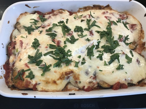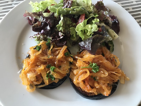Gegrillte Auberginen mit Käse überbacken, Zwiebeln und Salat |