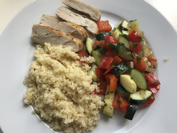 Zucchini- Paprikagemüse mit Bulgur und Hähnchenbruststreifen | Mit meinem neuen Kombigarer gekocht. Brokkoli mit Selleriestampf und kleinem Schnitzel. |