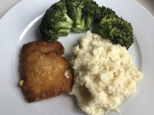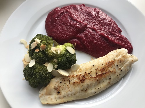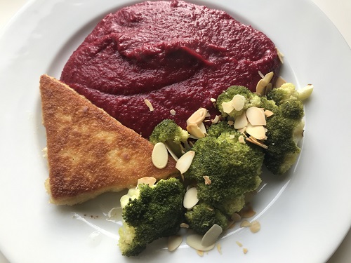 dto. mit einem Tomatengemüse | und hier paniert mit dem restlichen Ei | Rote Beet-Kartoffelbrei mit Brokkoli und Fisch |