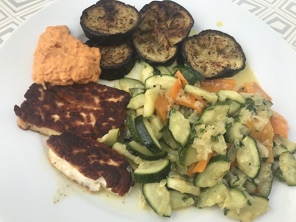 Kartoffelküchlein mit Rucola und Quark mit Curcuma und Salat | Fritatta mit Pilzen, Kürbiscurry und Gurkesalat | Gegrillte Auberginen, Zucchini-Paprikagemüse und Halumi, Aivar Dip |