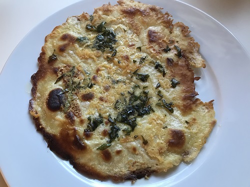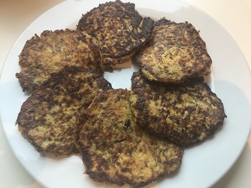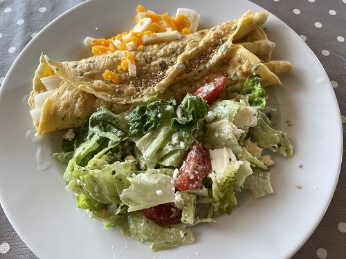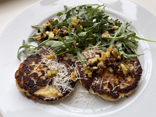 Pfannenkuchen mit Rucola | Gemüsepuffer mit Zucchini, Selleriewurzel und Karotten | dto. mit Gurkensalat |