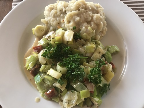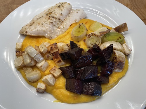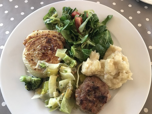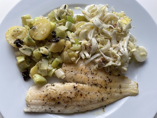 dto. mit paniertem Fisch | Gebratener Fenchel, Kartoffel-Selleriestampf mit Maronen, Lauchgemüse und Fleischküchle. | Restlicher Katoffelstampf mit Lauchgemüse und getrockneten Tomaten. |