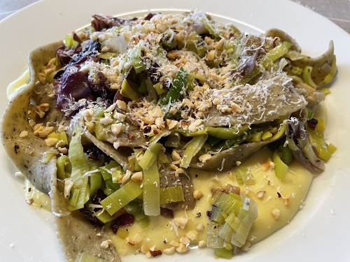 Radicchio-Porre-Nudeln auf Kartoffelschaum, Slow Carbs | Spinat-Linsen-Pfanne mit Chapignons , Slow Carbs | Ofengemüse und Kicherebsen-Rote Bete-Creme, Slow Carbs |