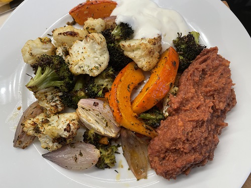 kleine Gemüsevariation: Auberginen mit Zwiebeln (Rest von gestern), Süßkartoffeln mit roten Zwiebeln und Lauchgemüse. | Blumenhohl aus dem Backofen mit einem Dip aus Quark, Joghurt, Curcuma, und Kräuter. |
