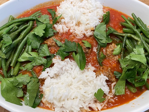 Hackbällchen mit Bohnen und Reis , Slow Carbs | Kabeljaufilet auf Kürbis-Kartoffelbett mit Lauch, Selleriewurzel und Rote Bete | Lauch, Brokkoli mit Kürbis-Kartoffelstampf und Salat |