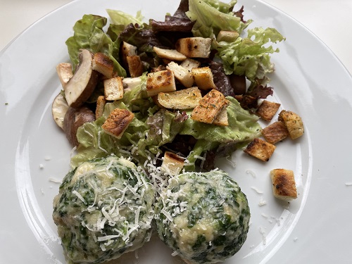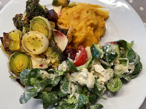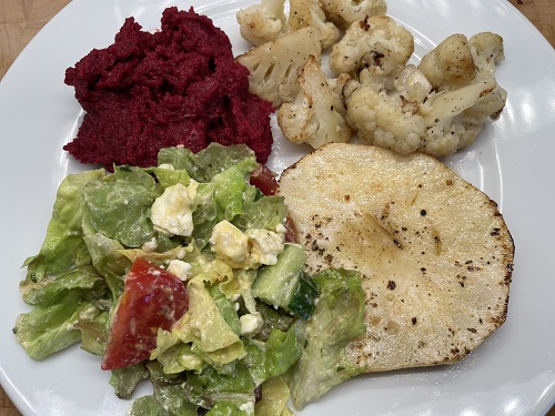 Blumenkohl, Selleriewurzel mit Rote Bete-Kichererbsenstampf und Salat | Blumenkohlstampf mit Paprika-Zucchinigemüse | Spinatknödel mit Parmesan und Salat mit Croutons |