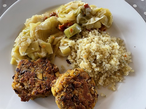 Pilz-Karottenbratlinge mit Lauchgemüse und Quinoa | Kartoffelküchlein mit Rucolasalat | Spargelpfannenkuchen mit Salat |