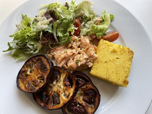 Gebackene Auberginen mit Polenta, Lachs und Salat |